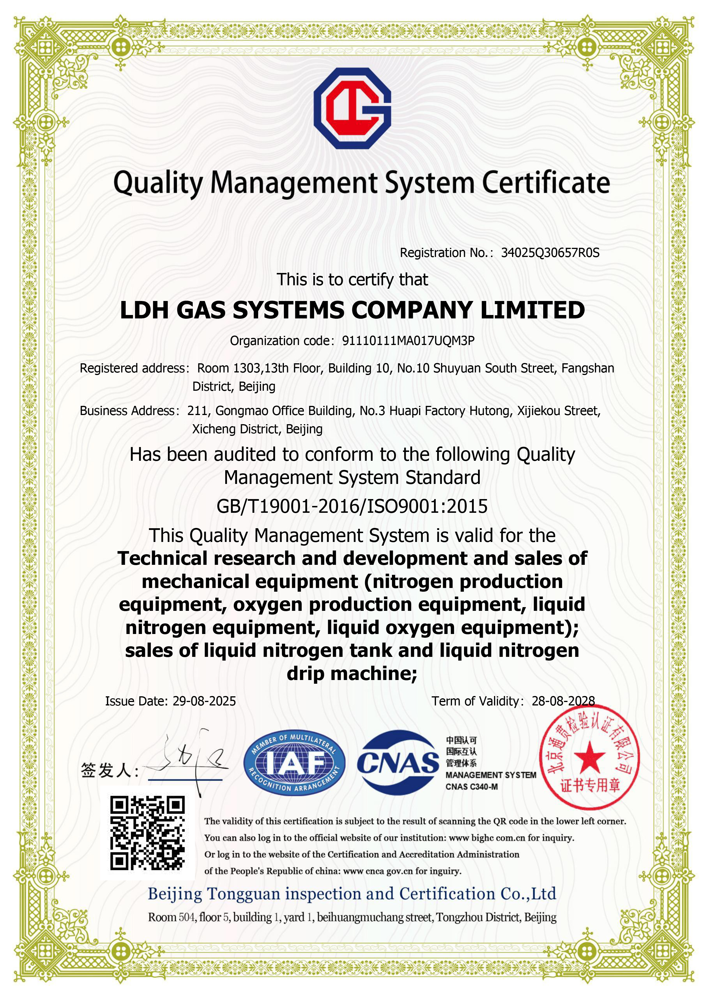 品牌也是选购液氮发生器时需要重点考虑的因素。北京立达恒科技发展有限公司专注于气体分离设备研发制造多年,秉持科学创新宗旨,以品质优良、用户信任为核心,致力成为气体分离设备专业服务商。其LDH Gas品牌寓意屹立行业前列、传递价值、做百年企业,从品牌理念上就能看出其对产品品质和服务的追求。该公司获得了多项认证,如质量管理体系认证ISO 9001、环境与职业健康安全管理体系认证ISO 14001和ISO 45001,以及国际产品认证CE、PED等,这些认证是对其产品质量和管理水平的有力证明,也体现了品牌的可靠性。